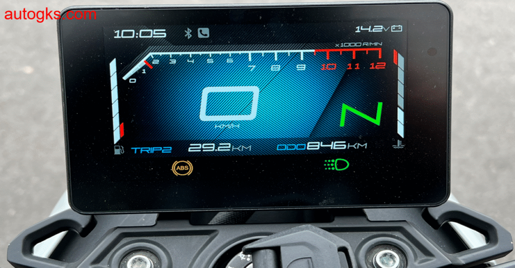 Here’s where the PM-01 surprises again. The 5-inch color TFT display is crisp, modern, and well-organized. The lion logo roars to life with a red or blue background when you key on, and all essential info is legible even in bright sunlight. Operating the display while riding is intuitive, thanks to a small switch cluster on the left bar, Peugeot deserves praise here for simplicity. There’s Bluetooth connectivity, allowing phone pairing and basic navigation prompts, useful if you’re not the map-in-pocket kind. But my favorite detail? The USB charging port cleverly hidden in the handlebar clamp. It’s such a thoughtful addition, especially for those who use their phones for navigation in remote places like this. It’s small details like these that make you forget the PM-01’s budget origins and remind you that someone, somewhere, actually cared during its design.