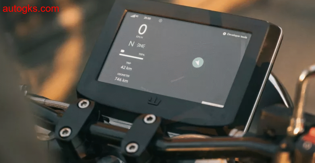 This is where vintage meets space age. Nestled between the “tank” and the handlebars is a large 7-inch tablet-style LCD screen that displays navigation, speed, charge level, and more. It’s a strange contrast to the retro aesthetic, but it works. The GPS maps come from RGNT’s own cloud system, saving your smartphone from battery drain. During my ride, I stored my phone in the hidden compartment on the mock fuel tank and relied on the bike’s display. It was seamless. Even with Gokarna’s spotty signal in the hills, the maps loaded fast and guided accurately. Also tucked under that screen is the charging port, flap-covered and discreet. The attention to design detail here is exceptional.